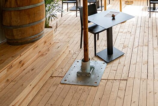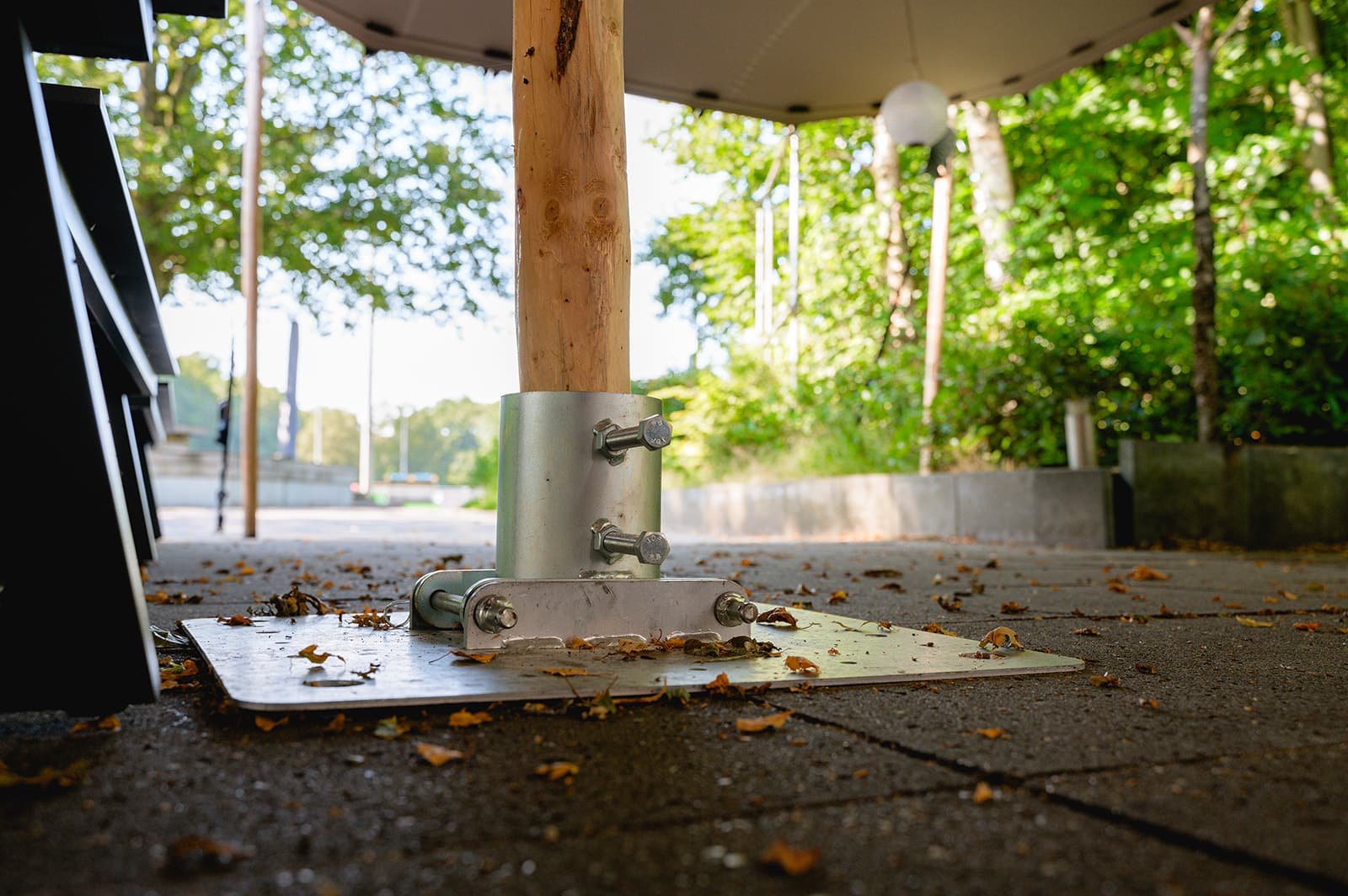 Placa de bază a fost proiectat in mod special pentru o instalare ușoară, chiar și atunci când cortul stretch este deja montat. Nu este nevoie să ridicați stâlpul central la înălțime; placa de bază este formată din două părți care pot fi ușor glisate sub stâlpul central și fixate.