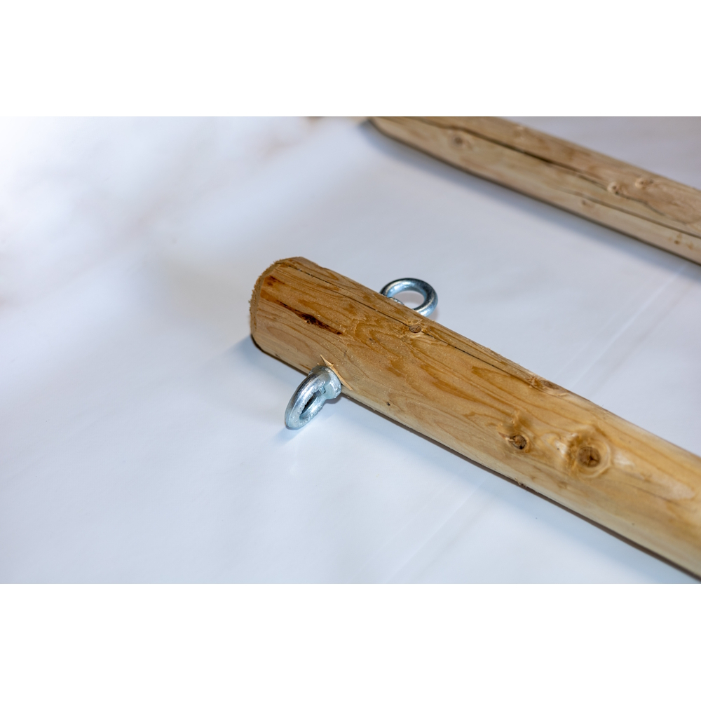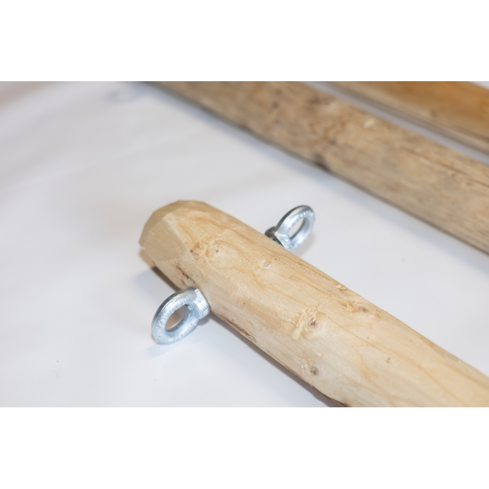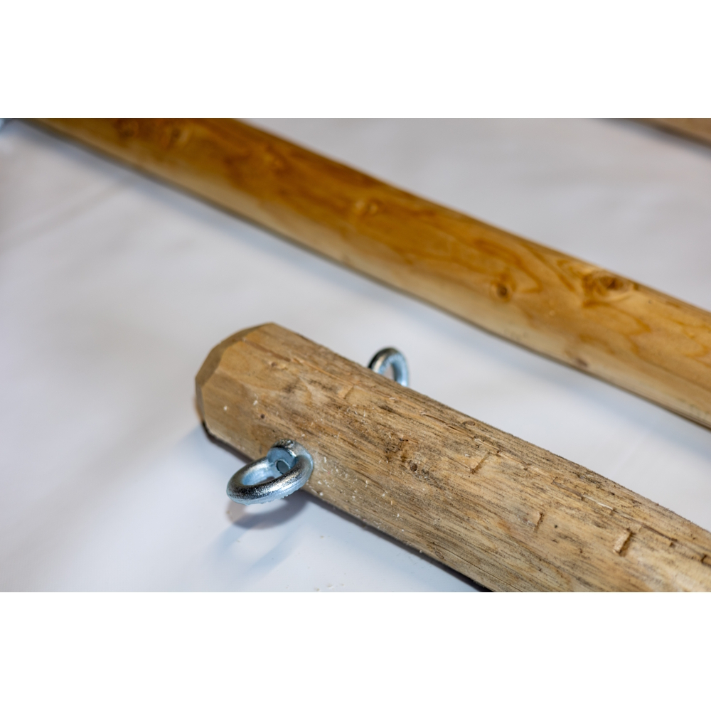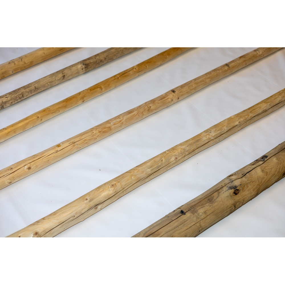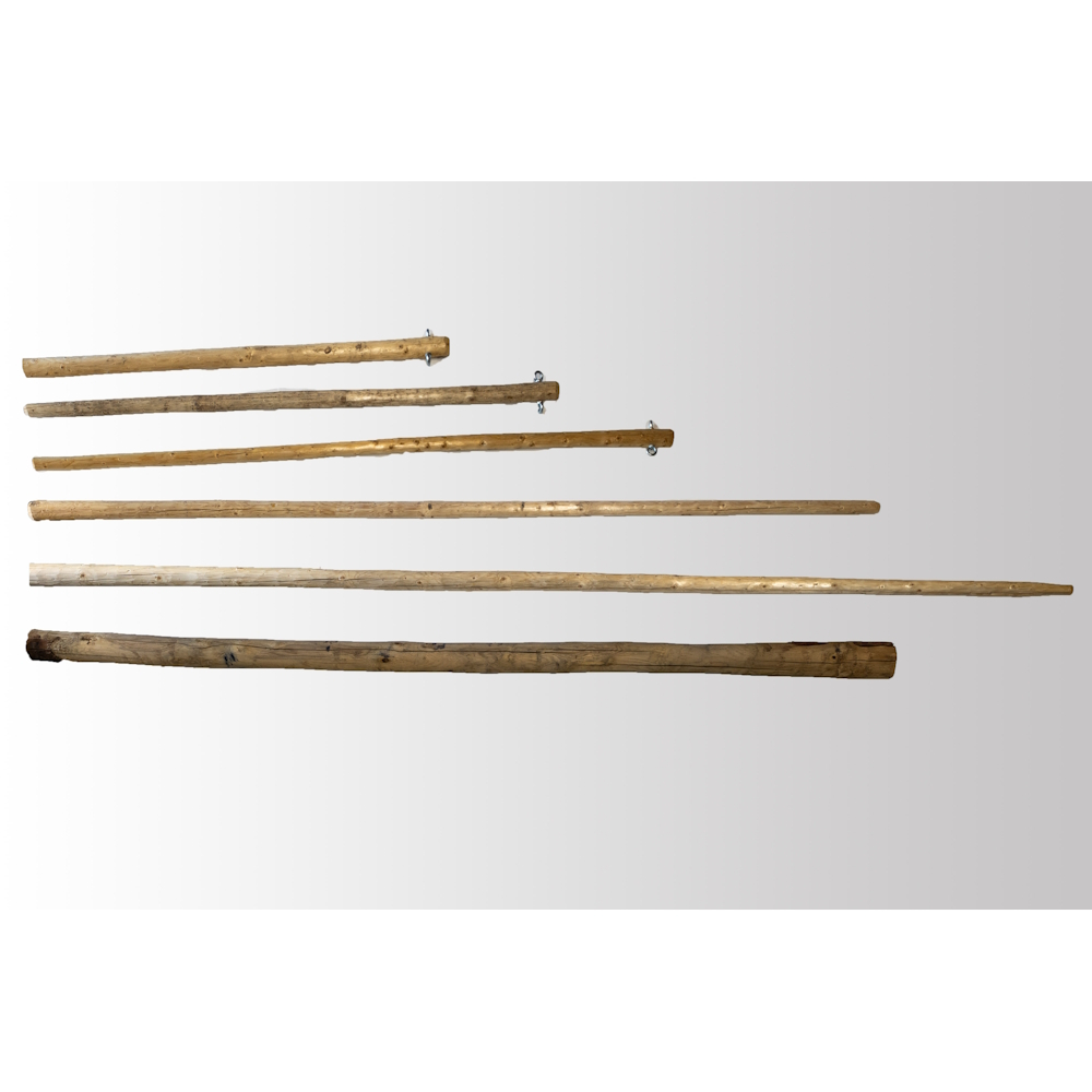 Stalp cort din lemn rotund natur tratat cu ulei de in. Diametrul stalpului este de 80 mm. Stalpurile laterale pentru tensionare cort sunt dotate cu 2 ochiuri cu surub de M12 (max 3 m). Stalpurile centrale de sustinere nu sunt ingustate la capat ca sa fie compatibil cu capacul de catarg (4m sau 5 m)